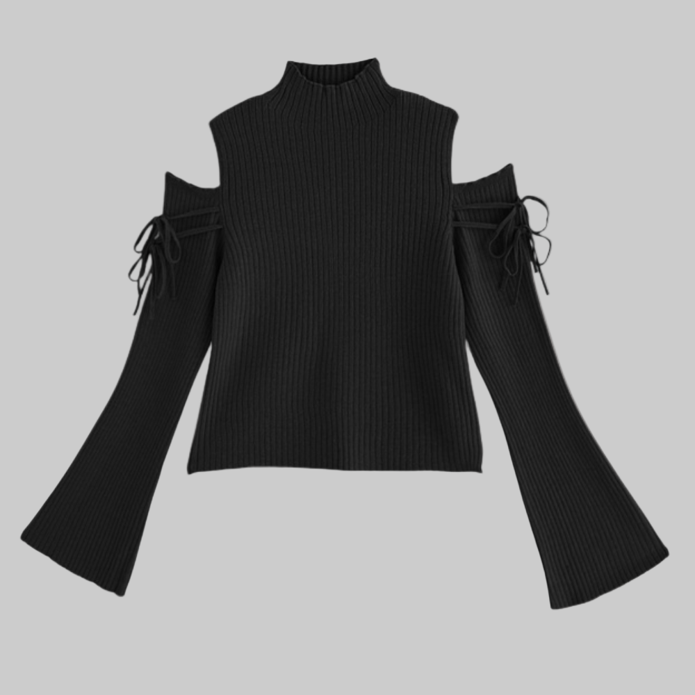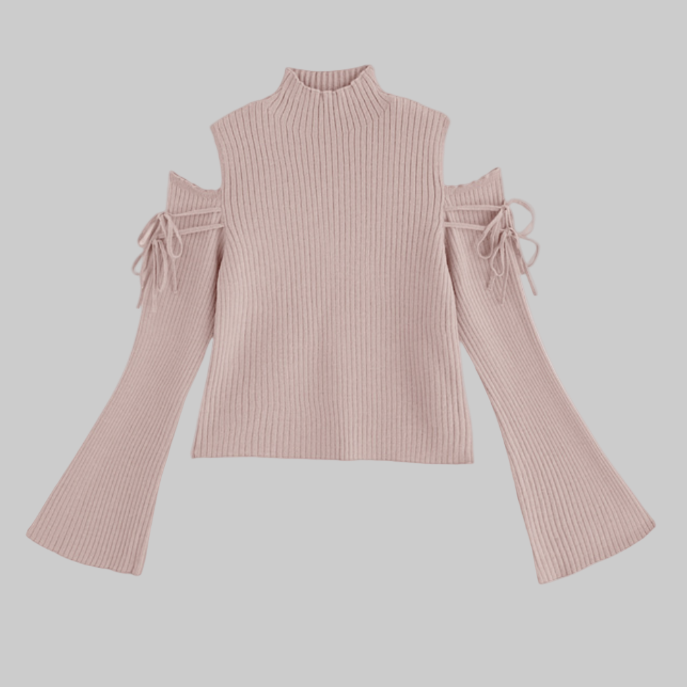 Ce pull pour femmes présente une encolure mi-haute laissant les épaules apparentes. Les manches longues s’élargissent progressivement vers les extrémités, créant une ouverture plus large au niveau des poignets. Un ruban est positionné sur chaque manche au niveau des biceps, marquant une séparation visuelle sous les épaules. La coupe du corps est droite et descend jusqu’aux hanches. Les lignes générales sont régulières tout au long du pull.