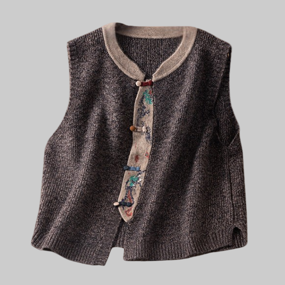 Ce pull sans manche pour femme est fait dans une maille régulière et présente une coupe droite de longueur intermédiaire. L’encolure adopte une forme en V, structurée par une bordure tricotée qui suit la ligne du col. Le devant est pourvu d’une série de boutons placés verticalement du haut jusqu’à l’ourlet, permettant d’ouvrir ou de fermer le vêtement entièrement. Les emmanchures sont larges et sans finition de manche, laissant apparaître une coupe dégagée sur les épaules.