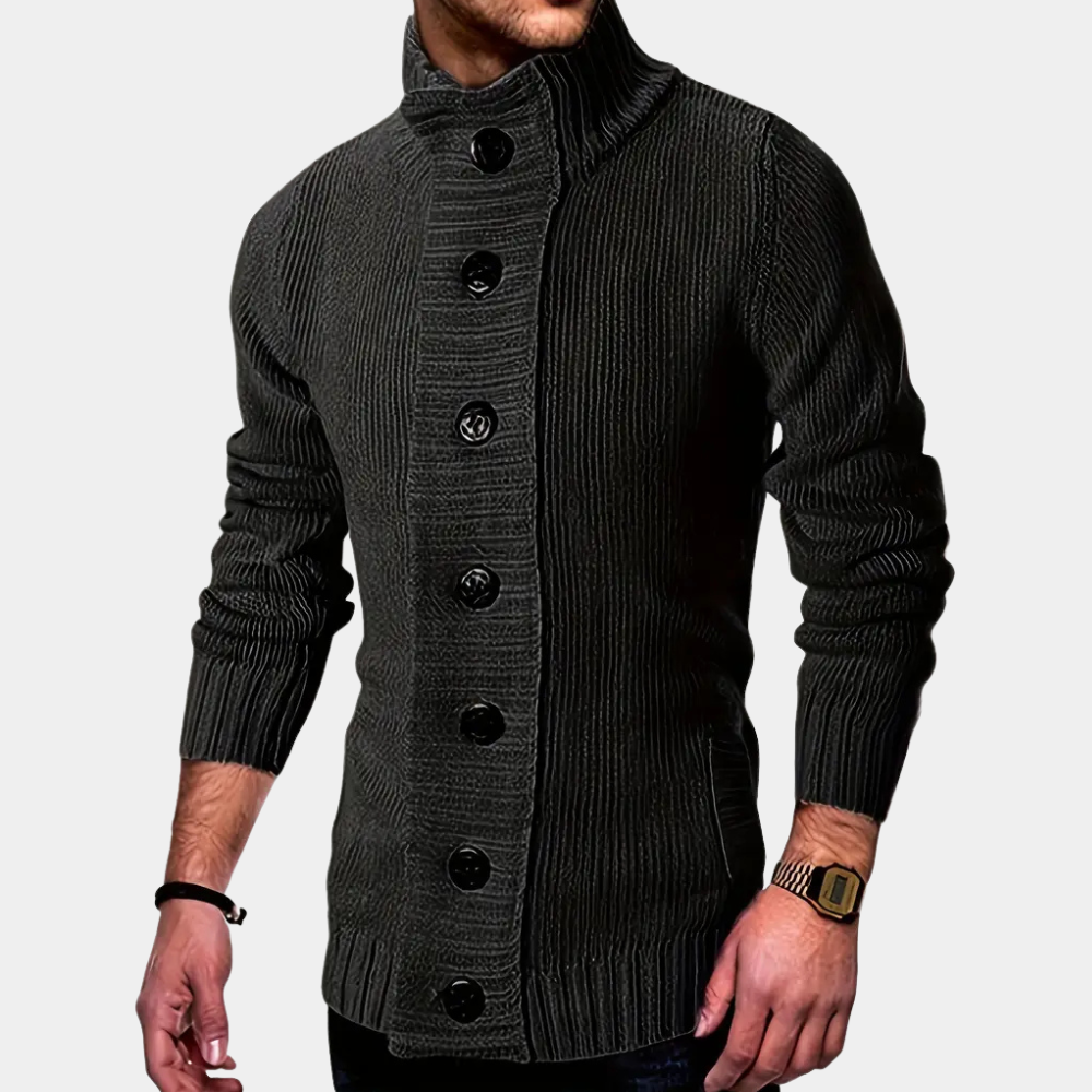 Ce cardigan pour hommes est doté d’un col haut et d’une fermeture frontale avec de grands boutons. Il comporte deux poches frontales ouvertes situées au niveau des hanches. Les manches sont longues avec des extrémités simples, et la coupe du corps est droite, descendant jusqu’aux hanches. Le tissu présente un motif de lignes régulier qui se prolonge sur l’ensemble du vêtement, créant une continuité visuelle entre le corps et les manches.