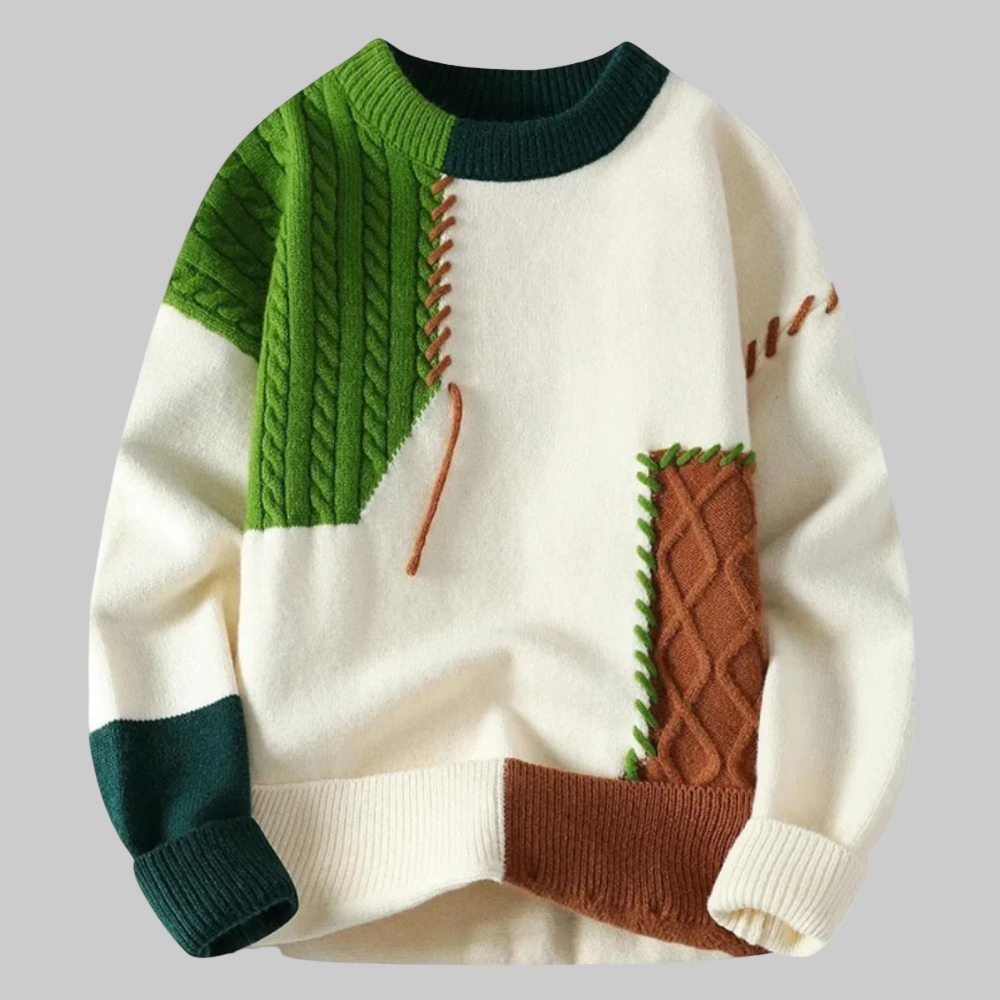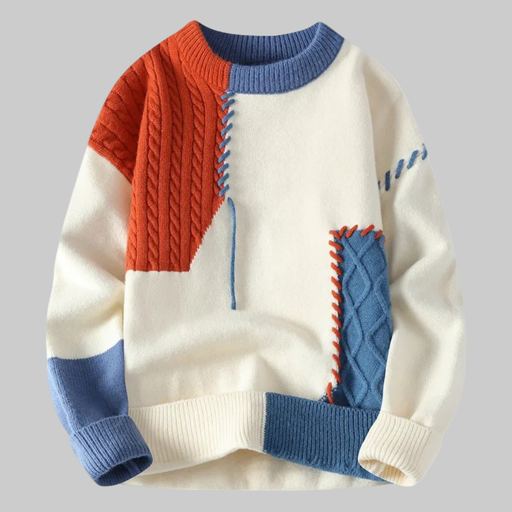 Ce pull à manches longues et col rond présente un design inspiré du patchwork. Ses coutures contrastées soulignent certaines pièces, accentuant ainsi l'effet superposé. L'encolure, les poignets et l'ourlet sont côtelés, tandis que le col et une manche sont bleus pour plus de contraste. La coupe ample et décontractée confère à ce pull un tombé décontracté.