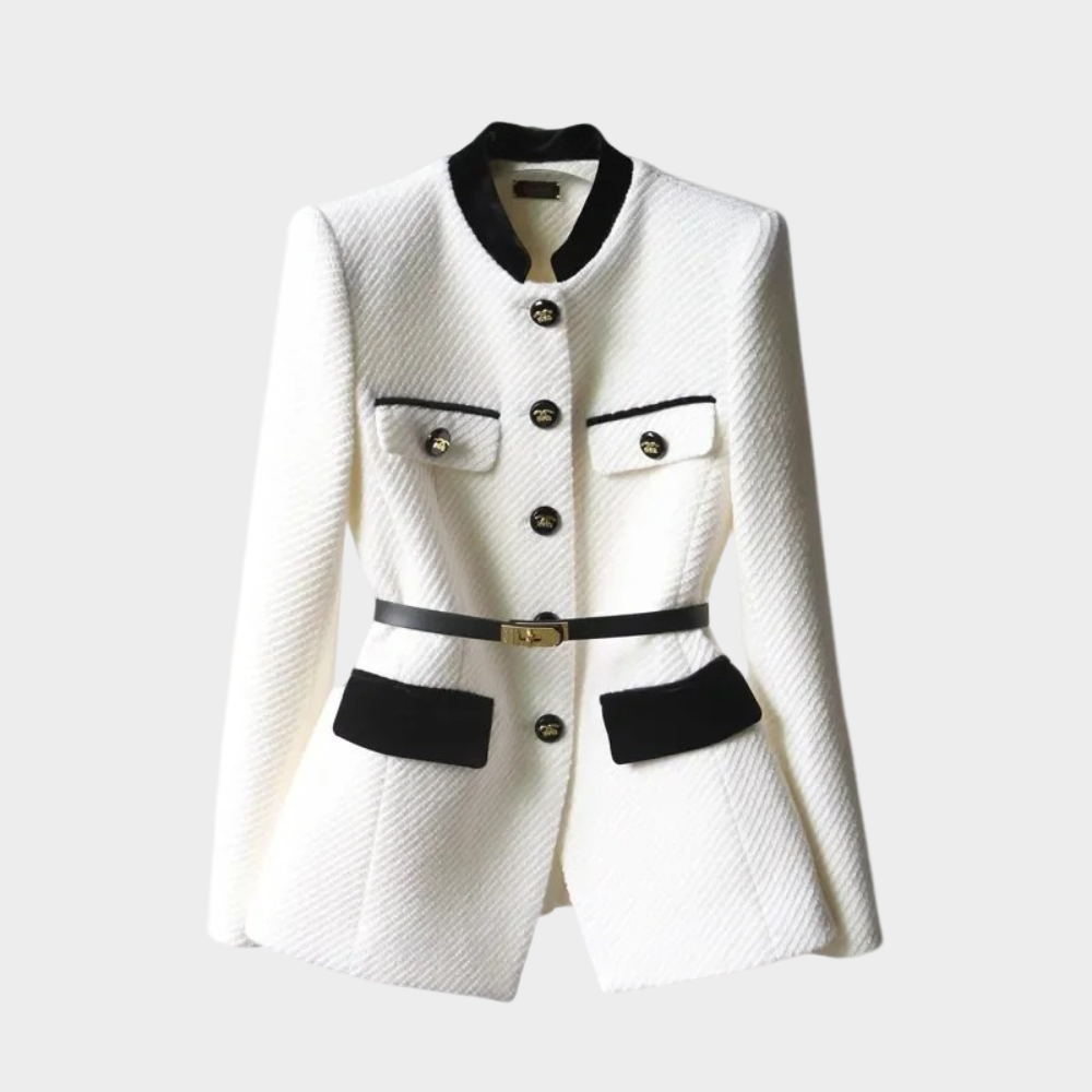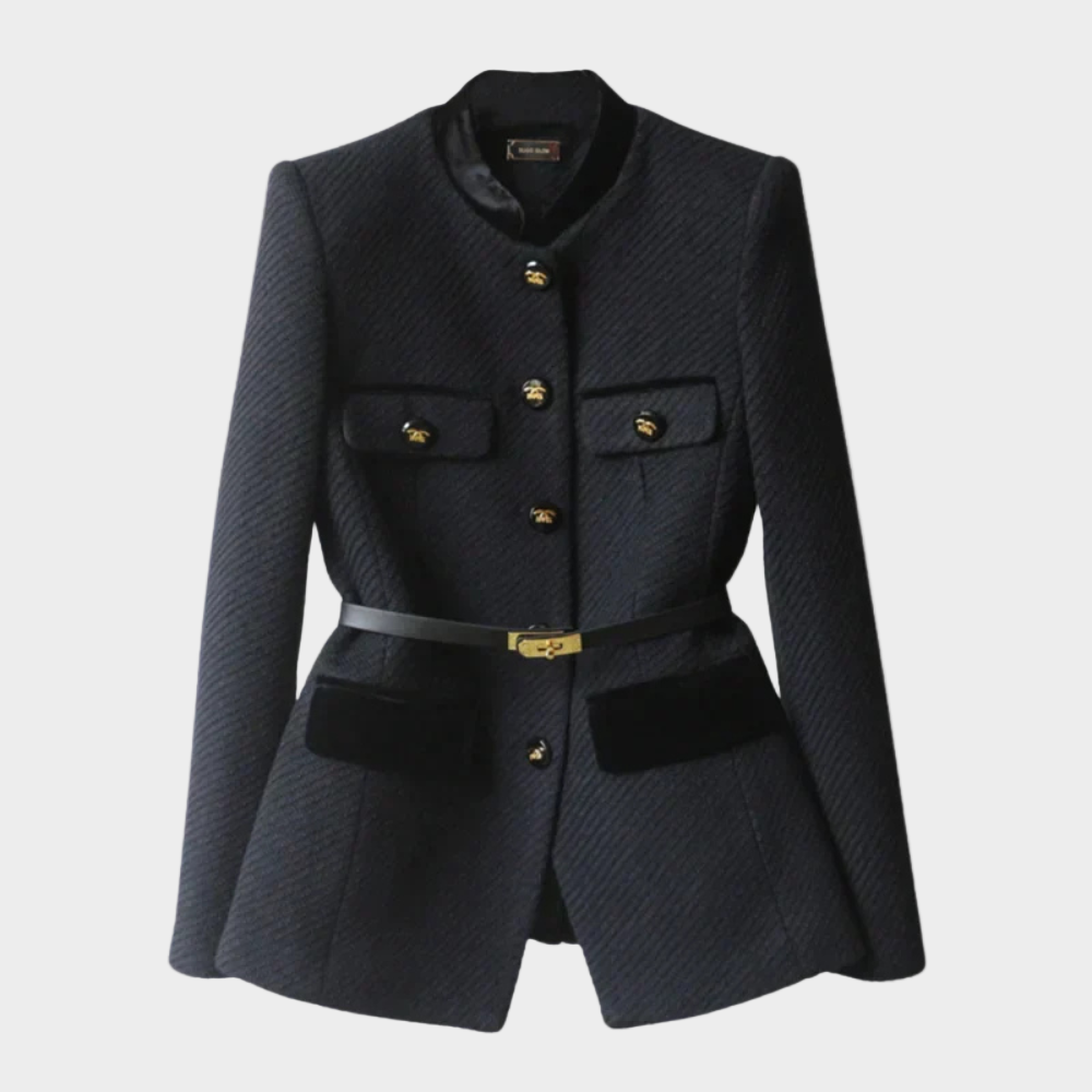 Manteau ceinturé pour femme avec mini col montant, boutonnage sur le devant, deux poches boutonnées sur la poitrine de chaque côté et deux poches supplémentaires à mi-longueur pour un look chic. Les épaules sont relevées pour donner de la hauteur. La ceinture est située à la taille pour affiner la silhouette et créer un effet fluide vers le bas.