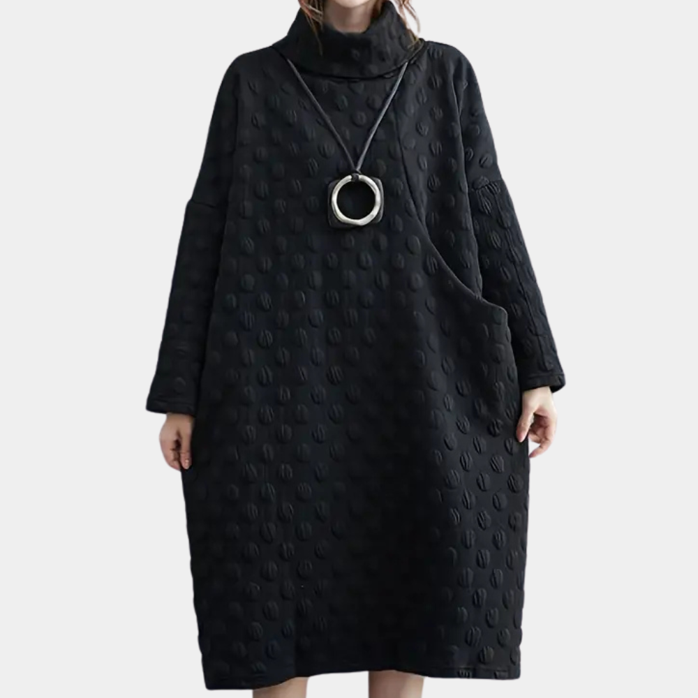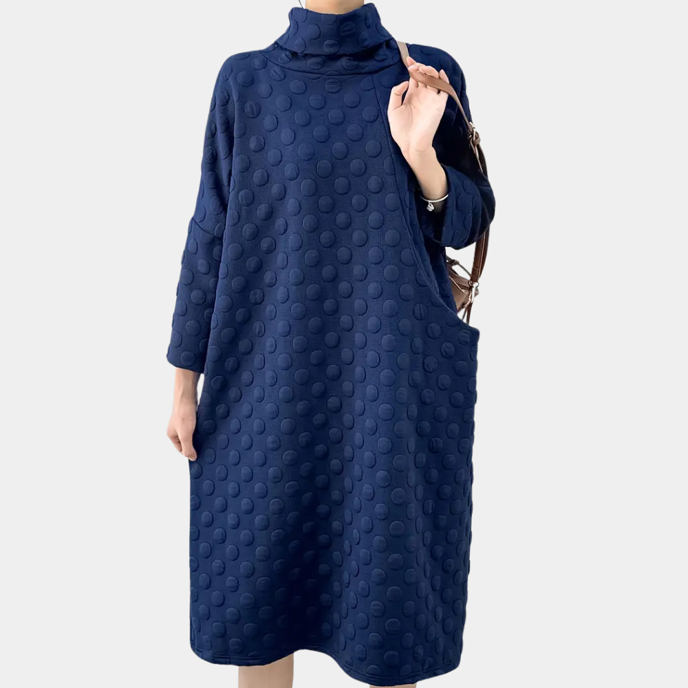 Cette robe pour femmes présente un col haut et un motif à pois réparti uniformément sur l’ensemble du vêtement. La coupe est droite et légèrement ample, offrant un effet oversize, et descend jusqu’aux genoux. Les manches sont longues avec des extrémités simples. La robe comporte deux poches latérales intégrées au niveau des hanches.