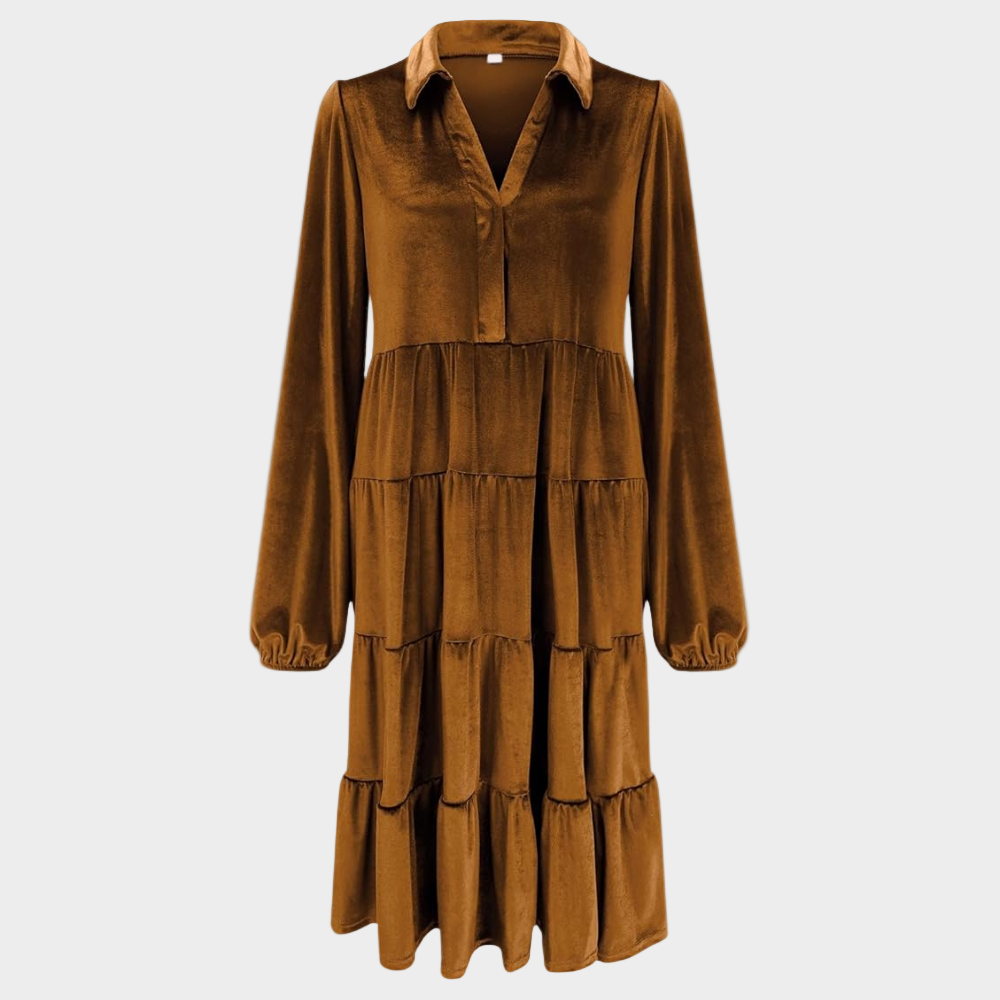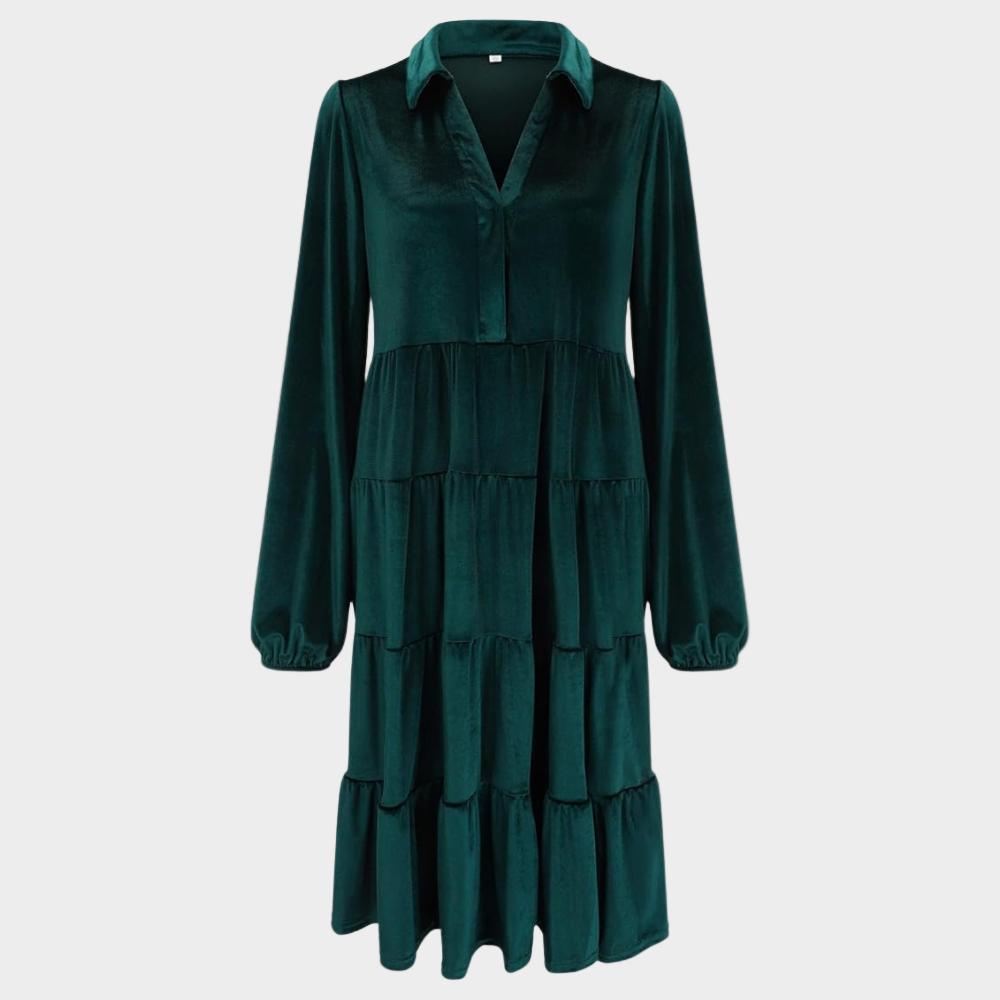 Cette robe pour femme dans une longueur midi avec des manches longues et un décolleté en V. La taille est rehaussée, créant une structure taille haute qui divise les parties supérieure et inférieure. La jupe s'étend dans une coupe ample avec des volants vers l'ourlet. Les poignets et l'encolure sont finis avec des coutures simples, et les coutures sont visibles le long des épaules, des côtés et de la taille.