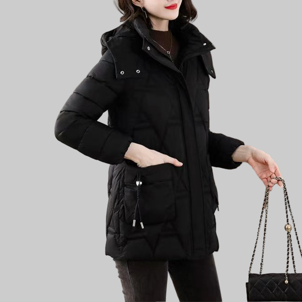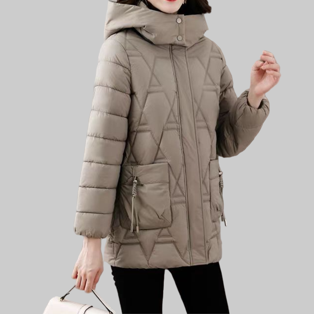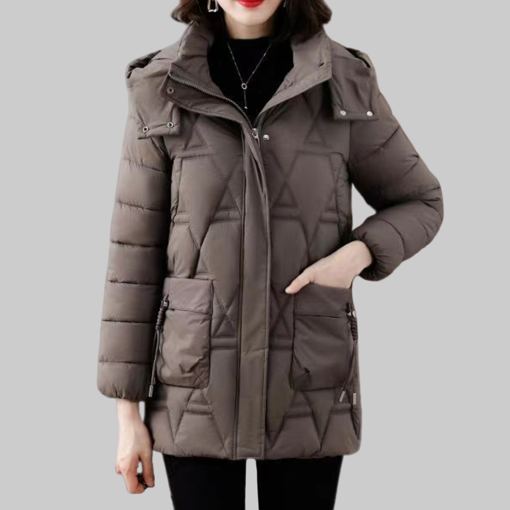 Cette veste pour femme présente un motif géométrique formé de losanges et de triangles sur l’arrière et les côtés. Les manches longues sont composées de sections horizontales régulières. La veste est munie d’une capuche amovible et d’une fermeture à glissière sur le devant. Deux poches latérales à fermeture éclair sont intégrées dans les coutures. La coupe est droite et la longueur descend sous les hanches.