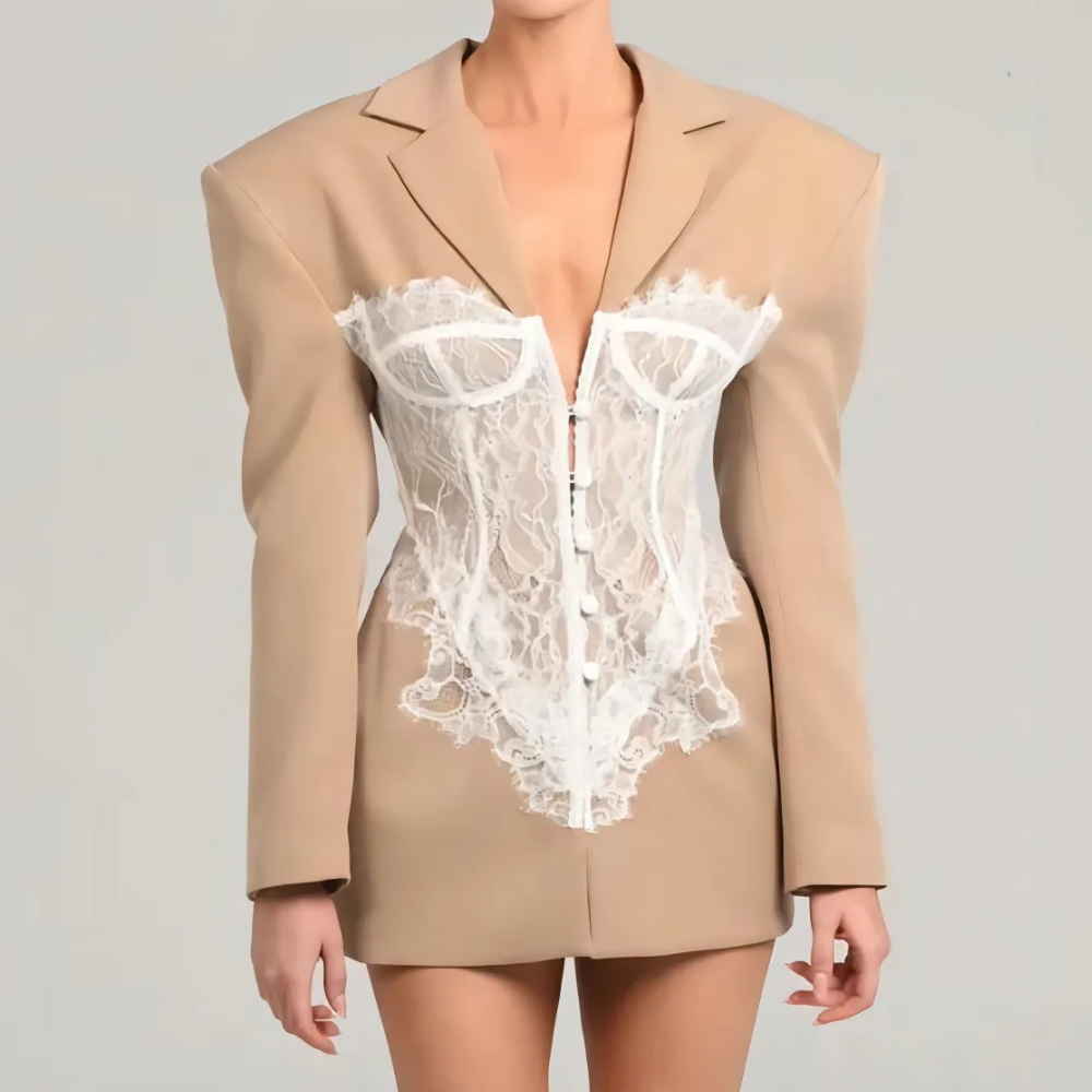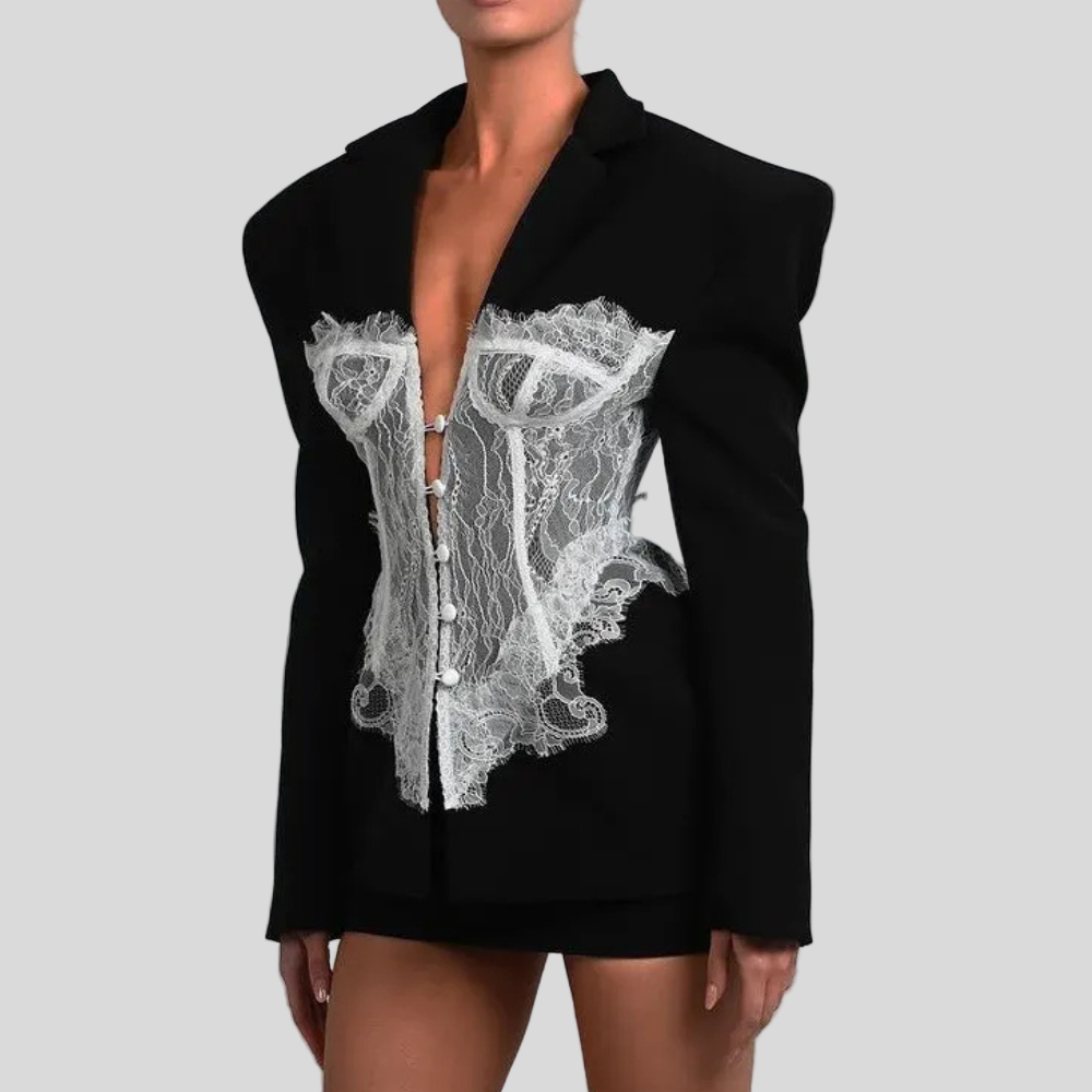 Cette veste blazer pour femme présente une coupe structurée avec un col à revers classique et une fermeture boutonnée sur le devant. Elle se distingue par un panneau corset intégré à la taille, réalisé en dentelle, qui crée un contraste avec la matière principale du blazer. Les manches longues se terminent par un ourlet droit, et les coutures visibles au niveau des épaules, des côtés et de la taille renforcent la construction de la pièce.