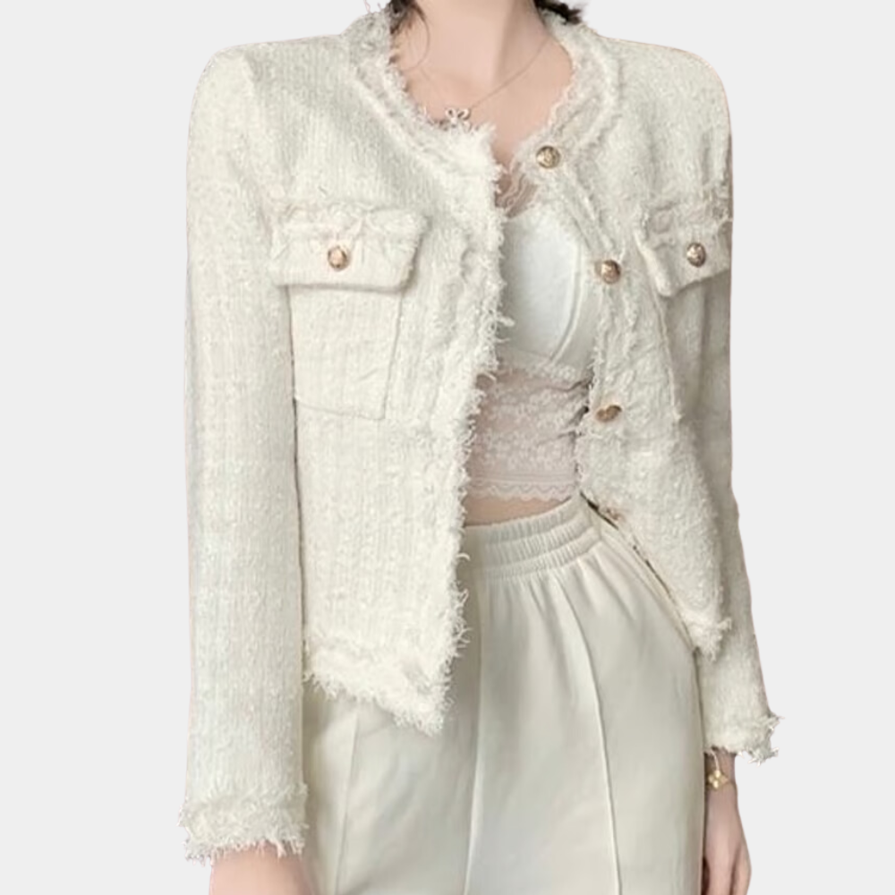 Cette veste courte pour femme est confectionnée en tweed et présente une silhouette droite et structurée. Elle est dotée d'une rangée de boutons sur le devant, allant de l'encolure à l'ourlet, disposés de manière simple et uniforme. Deux poches sont intégrées à l'avant, alignées avec la structure de la veste et finies sans décoration supplémentaire. Les manches sont longues et les épaules conservent une forme définie et régulière.