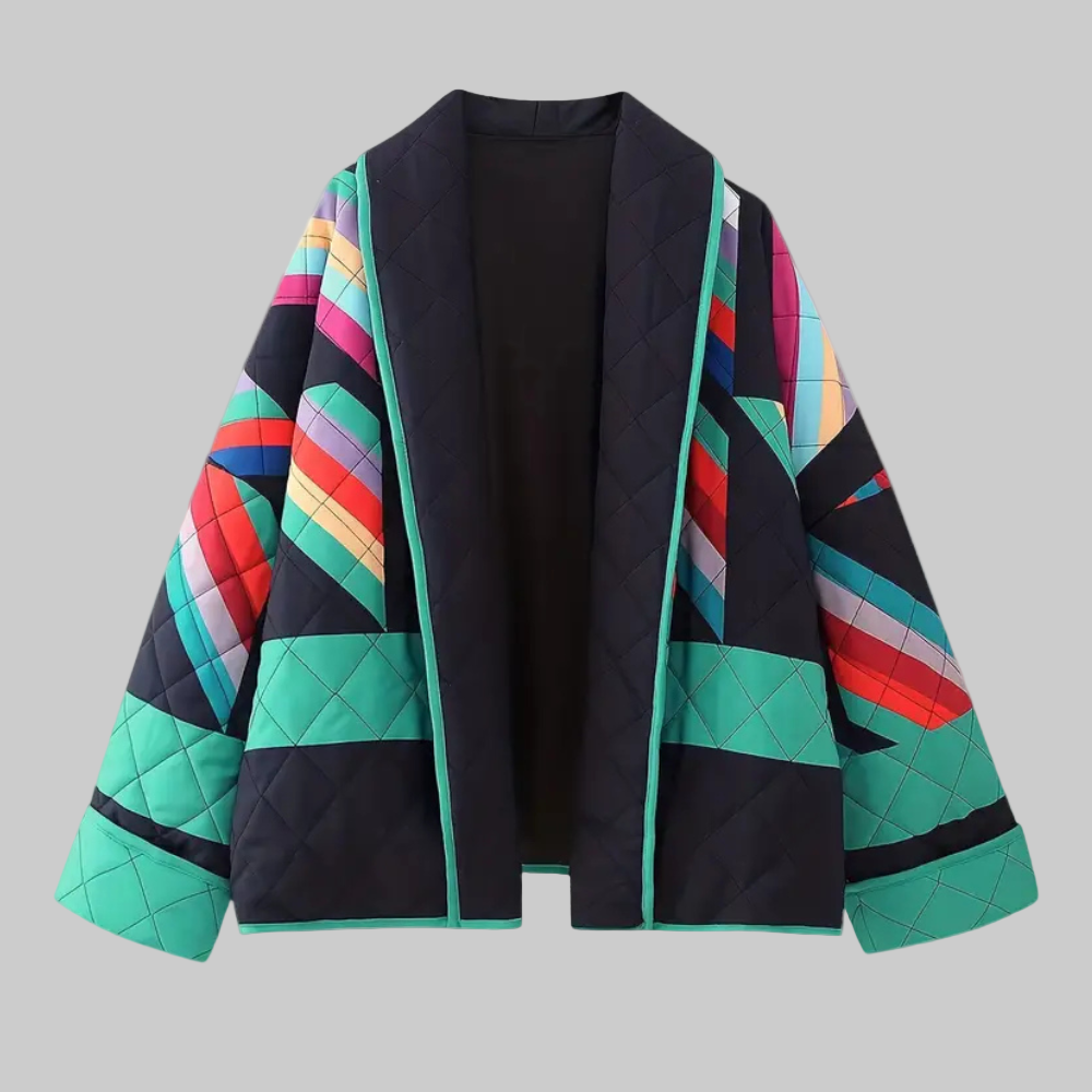 Cette veste matelassée pour femme présente une coupe droite et ouverte sur le devant, sans fermeture. La surface est divisée en sections géométriques avec des motifs multicolores disposés sur le corps et les manches. Les bords, y compris l'encolure, l'ouverture sur le devant et l'ourlet, sont soulignés par une bordure contrastée. Les manches sont longues et se terminent par de larges poignets, conservant la structure matelassée avec des coutures en losange sur toute la longueur.