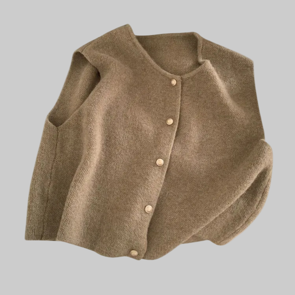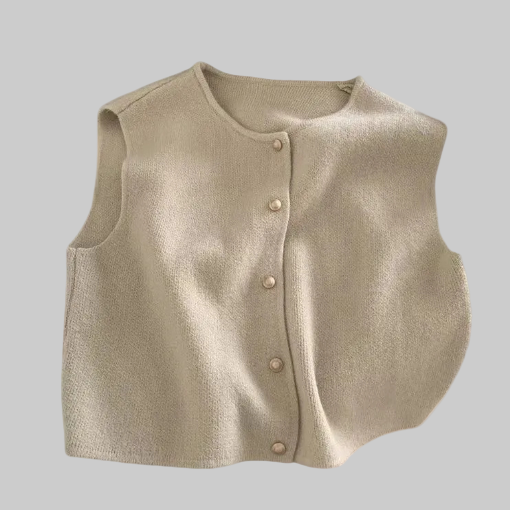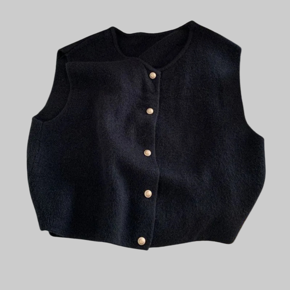 C'est une veste sans manches boutonné sur le devant. Sa coupe droite tombe juste en dessous de la taille, créant une silhouette épurée et minimaliste. La fermeture sur le devant est agrémentée de boutons arrondis espacés de manière régulière dans un ton assorti, ajoutant une structure subtile. Les épaules sont légèrement élargies, donnant au gilet un contour défini sans ajouter de volume. Il se porte par-dessus un chemisier à manches longues, soulignant son utilisation comme couche extérieure pour le style. L'ourlet est droit et l'ensemble présente un look simple et équilibré, idéal pour les superpositions.