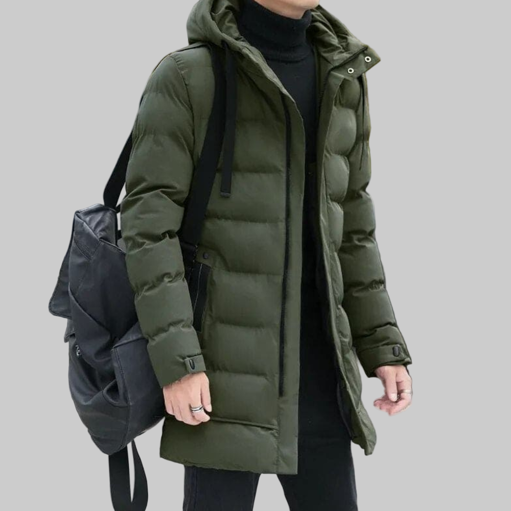 Il s'agit d'un long manteau à capuche au look matelassé, doté de deux poches latérales avec fermeture à glissière. La capuche est équipée d'un cordon de serrage pour ajuster sa taille et de deux boutons pour la maintenir bien en place sur la tête.