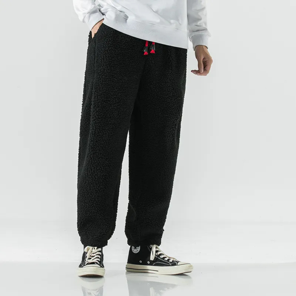 Ce pantalon ample est doté d'une taille élastique avec un cordon rouge contrastant qui s'étend sur le devant, ajoutant une touche esthétique. Les jambes sont larges et droites, avec un froncé à l'ourlet qui repose autour des chevilles. Des poches latérales sont intégrées au niveau des hanches, s'harmonisant avec la coupe décontractée. La silhouette générale met l'accent sur le volume et un style décontracté et décontracté.
