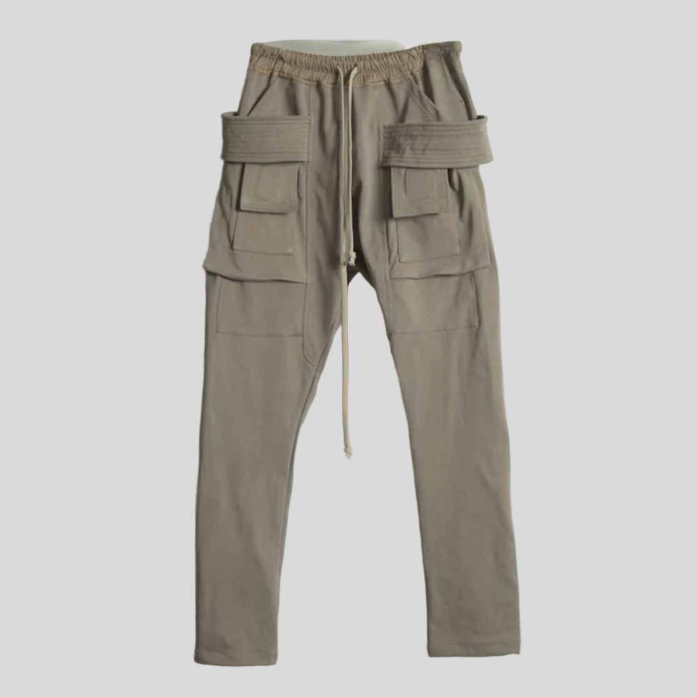 Ce pantalon cargo pour homme est fait avec une taille élastique équipée d’un cordon de serrage ajustable à l’avant. Le modèle présente une coupe droite et des jambes longues qui s’étendent jusqu’aux chevilles. Il dispose de plusieurs poches fonctionnelles : deux poches latérales au niveau des hanches, deux grandes poches à rabat placées sur le devant des cuisses et deux poches supplémentaires cousues en dessous. Les poches supérieures sont renforcées par des rabats larges à surpiqûres visibles, accentuant la construction du vêtement. Les coutures marquées le long des jambes et sur les côtés définissent la structure générale du pantalon. L’ourlet inférieur est droit, sans finition élastiquée ni fermeture, assurant une ligne simple et régulière.